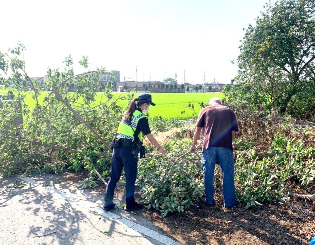 二崙分駐所警員張鈞喨及黃素珍獲報到場二崙鄉中和路,發現路樹倒塌導致一車道無法通行,警方立即於現場警示來車並實施交管,同時通報相關單位。此時熱心民眾路過,使用切割器材排除倒塌路樹,與警方攜手不到1小時便將全數樹幹及樹枝移置路旁,使交通恢復順暢。