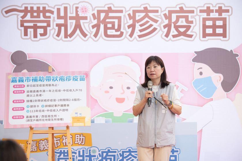 嘉義市衛生局長廖育瑋說明水痘-帶狀疱疹病毒初次感染時會引發水痘,之後病毒會潛伏在體內,當年紀大或免疫力變差時再度發作,引發帶狀疱疹(皮蛇)。50歲以上的成人有99.5%感染過水痘-帶狀疱疹病毒,而有三分之一的人會在一生中罹患帶狀疱疹。帶狀疱疹好發於50歲以上成人、具帶狀疱疹病史者、及免疫功能低下族群,發病時會產生單側性、疼痛性、水泡性皮疹,部分患者會併發帶狀疱疹後神經痛,令人疼痛難耐。而預防帶狀疱疹及其併發症最好的方法就是接種疫苗,目前帶狀疱疹疫苗屬自費疫苗,疫苗費用昂貴,期望透過市府補助帶狀疱疹疫苗接種,減輕弱勢長者的負擔,提升保護力。
