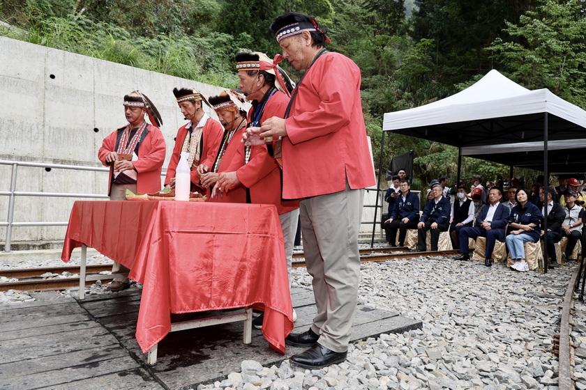 典禮開始前,祈福儀式由鄒族特富野社汪義福頭目、鄒族特富野社陳明川長老、石明華長老、高德生長老及來吉部落梁崇效前主席面向隧道洞口的東方,誠心用鄒族母語向山神說明工程已經順利完工即將恢復行駛…,過程中邀請大家一起舉杯向山神敬酒,並與來賓分享豬肉、小米酒、糯米年糕等祭祀用品,祈求保佑林鐵火車出入安全,一路順隧。