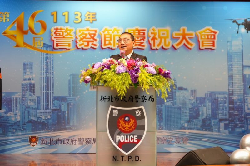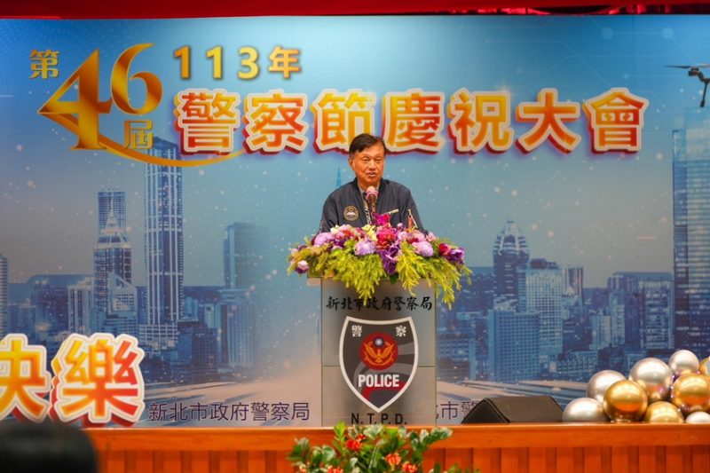 市長侯友宜致詞時說,在警察局全體同仁的努力之下,各項治安、交通及為民服務工作,成效斐然,特別代表市府團隊與新北市民,對全體警察同仁過去1年無論晴雨的犧牲奉獻,表達由衷感謝之意。在治安方面,成績績效卓著,更榮獲「112年國家警光獎」團體組偵查犯罪類第1名;領先全國成立「詐欺防制辦公室」,組成「新北打詐隊全面宣導團」,結合本府各局處力量,透過電化、實體、文宣、網路各管道及異業結合,共同全面宣導識詐,強化市民防詐免疫力。113年截至5月底,查獲不法詐欺集團111件1,189人,查扣不法所得(總價值)新臺幣6億2752萬餘元,另透過「ATM車手整合機制」溯源追緝幕後首腦,查獲詐欺車手484人,此外,成功攔阻詐騙款項合計556件、攔阻金額3億7,082萬餘元,無論打詐或攔阻詐騙,表現均較112年同期成績優異。