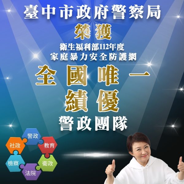 【台中訊】鑑於家暴事件兩造關係的特殊性,往往涉及雙方當事人的感情、親情牽絆,充滿安全威脅及複雜度,且家暴事件對於被害人、家庭及社會所造成重大之影響,倘未適當介入處理,加劇之暴力循環也可能導致家暴事件惡質化,造成無法挽回之家庭悲劇。衛生福利部自98年起即策定「推動家庭暴力安全防護網計畫」,鼓勵各地方政府加強協調整合社政、警政、教育、衛生、司法等單位,建立跨領域網絡分工合作,落實危險評估,以建構綿密之防治網絡,衛生福利部督導團隊「首度」在去(112)年實地考核各縣市推動執行成效,考核結果在本月「家庭暴力防治月」揭曉,臺中市政府警察局榮獲全國唯一「績優警政團隊」,備受讚賞,局長李文章肯定相關單位人員在推動家暴防治的積極及用心,對團隊員警認真努力執行亦深表肯定,也在今(25)日市政會議上獻獎,共享團隊榮耀。