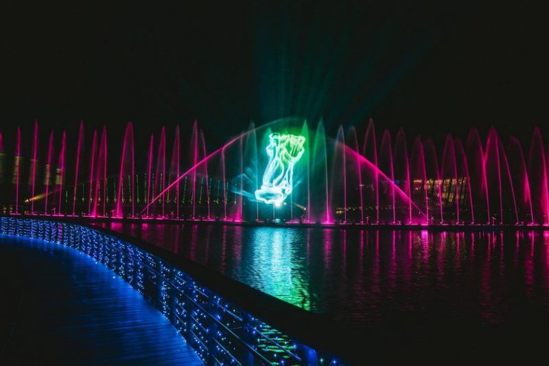 故宮南院暑期迎客,火力全開!園區有全臺最長水舞「水樂之夜」,自晚間6時至9時,每15分鐘演出1場,搭配十鼓擊樂團改編作品〈憶想之門〉及絕美雷射光雕,是視覺、聽覺雙重饗宴。