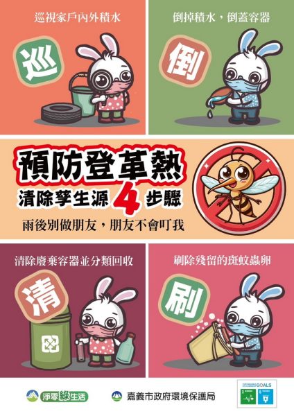 大雨過後的一週是防治登革熱的關鍵期,因風災後產生的積水處,為病媒蚊良好的孳生環境,若病媒蚊在積水容器中產卵,約一週後就能羽化為登革熱病媒蚊傳播媒介,兩週左右該區域的病媒蚊密度就有可能上升。因此,嘉義市政府環境保護局提醒應主動檢查居家周遭環境,落實「巡」、「倒」、「清」、「刷」四個原則,清除戶外堆置容易積水的物品,如廢棄輪胎、雜物及容器等,也要留意屋簷邊緣的「天溝」及防火巷的「屋後溝」,因泥沙雜草淤積,排水功能失效,容易成為病媒蚊孳生死角,務必清除或倒掉積水,不讓病媒蚊有機可趁。