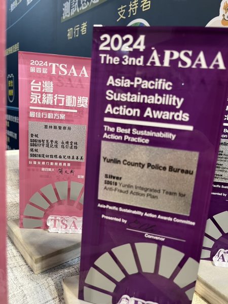 雲林縣警察局從眾多競爭者中脫穎而出,繼2022年代表雲林縣政府參加台灣永續行動獎獲得一銀的佳績之後,2024年再度以「雲林整合性團隊打詐行動方案」參加亞太永續行動獎獲得SDGs16-促進和平多元社會確保司法平等項目中的銀獎。台灣永續行動獎方面則是以「智慧警政永續雲林」、「護幼點線面兒保真善美」兩項專案分別獲得SDGs16-促進和平多元社會確保司法平等項目中金獎及銀獎,「守護記憶指引迷路」則獲得SDGs17-建立多元夥伴關係項目中的金獎。今年四個專案全數獲獎,更是非營利事業組中政府部門裡各級警察機關獲獎數最多的單位,大大的鼓舞了雲警的團隊士氣!