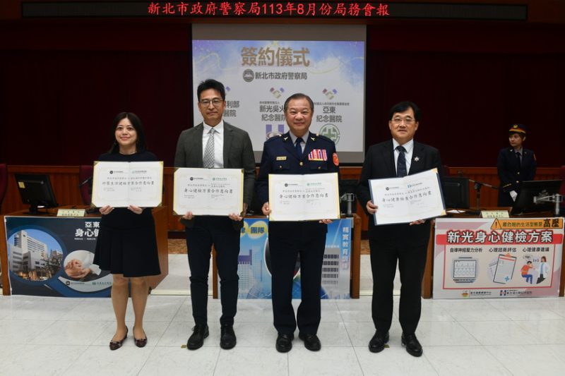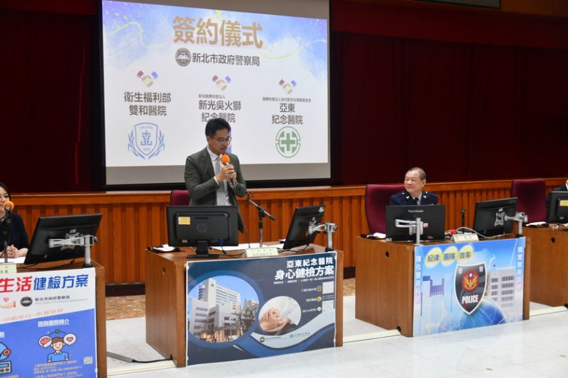 警察肩負維護社會治安重責,在工作及生活面對巨大的壓力,為維護警察同仁的身心健康,讓同仁面臨生理及心理健康問題時,即時提供協助,新北警局特洽新光醫療財團法人新光吳火獅紀念醫院、衛生福利部雙和醫院及醫療財團法人徐元智先生醫藥基金會亞東紀念醫院合作,首創將「身心健康檢查」及「紓壓生活健檢」等多元服務納入警察人員健康檢查補助方案,並於今(21)日舉行簽約儀式。