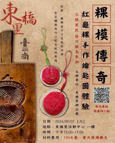 下午三點 粿模傳奇餅模達人黃鳳鳥老師將在東橋里活動中心 分享畢生餅模收藏,隨機發送限量迷你餅模小吊飾,歡迎大家一起來聆聽最有古早味的 粿模故事,還有紅龜粿鑰匙圈手作課程。