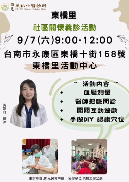 當日從 早上九點 開始,開元民佑中醫診所義診活動 在 東橋里活動中心一樓 舉辦。