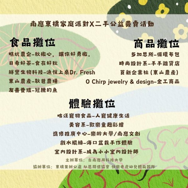 下午兩點 ,南應大 • 東橋家庭派對 X 二手義賣 ,公益市集活動,將在 小橋公園 登場;多個食品攤位、商品攤位、手作體驗攤位,非常好玩,歡迎大家和南應大一起來開家庭派對🎉。