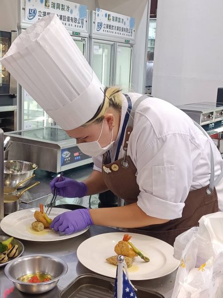 (醒吾科大廖雁翎正聚精會神為參賽作品精心點綴,最終獲評審青睞,榮獲西式主餐-海鮮銅牌。)