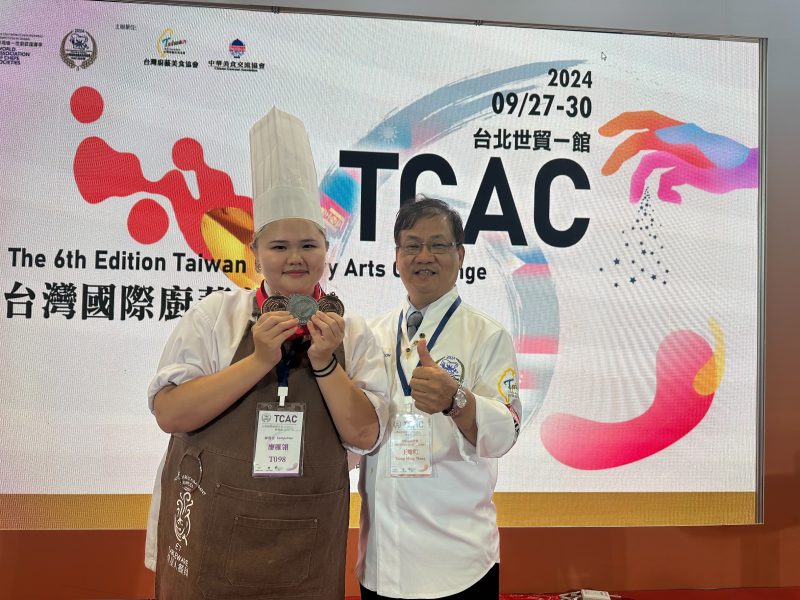 同樣是鐵板料理研究社的陳煒翔,此次比賽也獲得了中式肉類-家畜銀牌的好成績。他表示,從一開始不知道流程、也不知道菜名,一路上鐵板料理研究社的老師一步一步指引我、教導我,很高興第一次參加比賽就能奪牌,很謝謝朱俊松老師不厭其煩的指導。與廖雁翎有共同比賽經驗的餐旅系學生江昕倫,本次也有明顯的進步,取得一銅二佳作的好成績。他堅定的說:「這次比賽交到很多朋友,王聰明老師也在流程和料理味道上,給予很多的幫助,很開心這次有得獎。」除了料理烹調競賽組學生,醒吾科大餐旅系張芷菱,也於本次TCAC 台灣國際廚藝美食挑戰賽,參加傳統飲調組,並拿下該組銀牌。她表示,這次比賽給予很多的進步空間跟想法,包括評審跟指導老師都給予許多建議和幫助,讓她受益良多,雖然只拿到銀牌還是很開心。