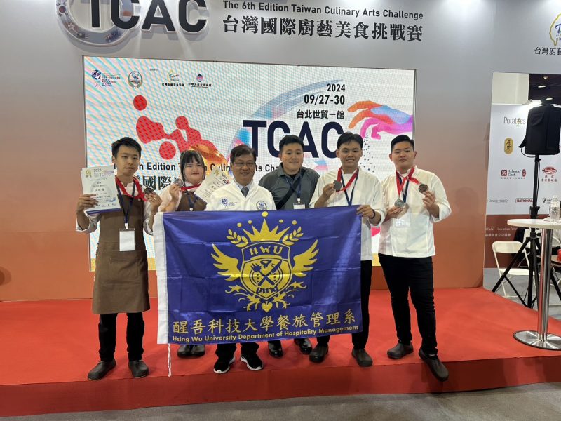 第六屆TCAC 台灣國際廚藝美食挑戰賽日前於台北世貿一館舉行,醒吾科技大學共派出5名選手與賽,由餐旅管理系老師王聰明、朱俊松與觀光休閒系老師王建華帶隊,共獲四銀四銅二佳作,成績亮眼,尤其餐旅系學生陳煒翔第一次參加大型賽事就摘下銀牌,為校爭光。