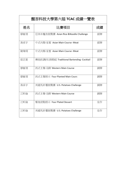(醒吾科技大學第六屆TCAC成績一覽表。)