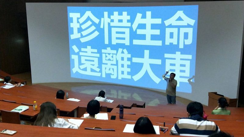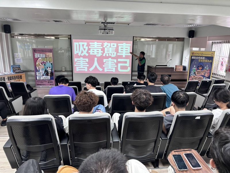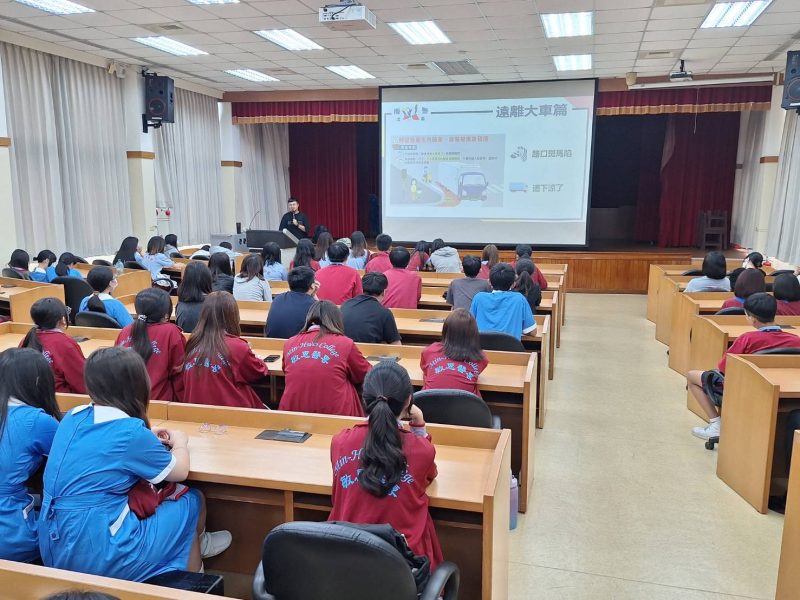 台上警察局交通大隊交安宣導團的講座,以實際毒駕案例,向台下師生說明吸毒駕車的危險性,希望讓參與師生了解到毒駕對用路人的危害,提倡人本交通文化,共同守護用路人安全;交通大隊大隊長洪國哲表示:毒駕對於交通安全危害相當大,吸毒後可能出現幻覺幻聽、注意力下降、肌肉抽搐及肢體協調變弱等,毒品破壞了駕駛人對時間跟空間的認知能力,肢體也無法即時反應,直接影響駕車安全,交通大隊會持續落實校園宣導工作,預防酒駕毒駕等行為,並同步加強取締,建立「酒駕毒駕零容忍」的正確觀念,避免害人又害己。