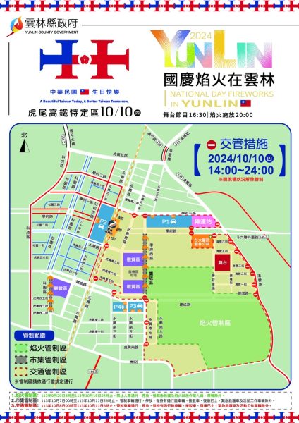 2024 國慶焰火10日晚上將在雲林縣虎尾高鐵特定區登場,為維護國慶日當天焰火施放安全及交通疏運順暢,警察局將動員1600餘名人力,當日下午2時起對清雲路、學府一路、永興路及廉使分線等路段實施交通管制,並加強會場內安全維護及防搶防竊工作。