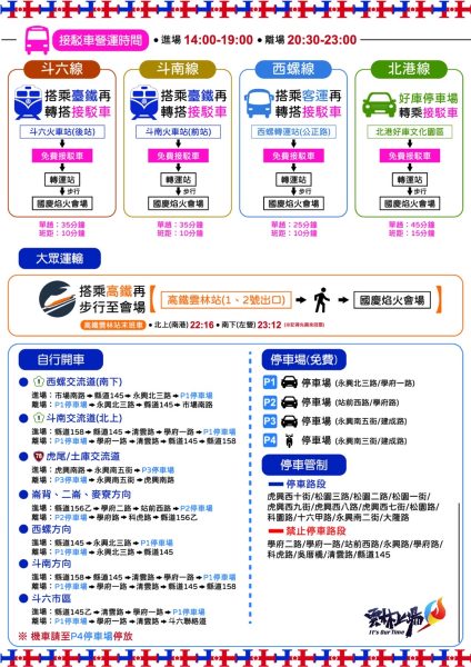 本次雲林縣政府規劃4 條接駁路線、170 部接駁車,密集接送斗六火車站、斗南火車站、西螺轉運站及北港糖廠的民眾,往返活動會場轉連站;另會場緊鄰雲林高鐵站,民眾亦可選擇搭乘高鐵經 1、2號出口再步行至會場;針對自行開車民眾,縣府規劃五條(縣道145乙、吳厝橋、清雲路、縣道156乙、雲禾大橋)主要進出動線,以不同的地區走不同的路方式,透過進、離場分流減少交通壅塞。