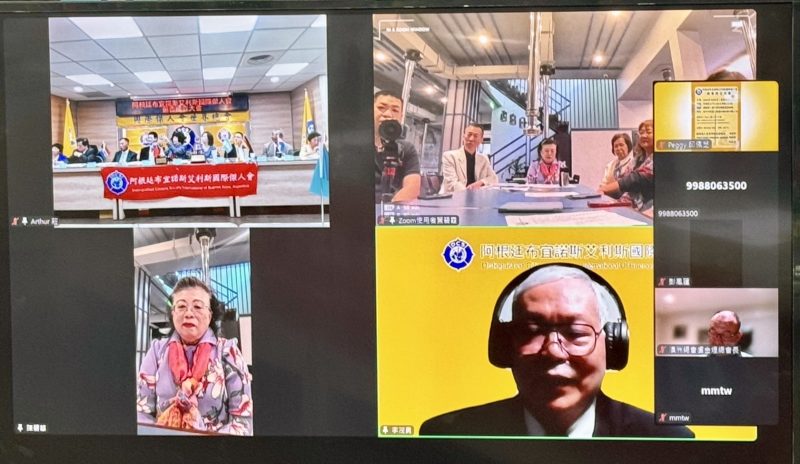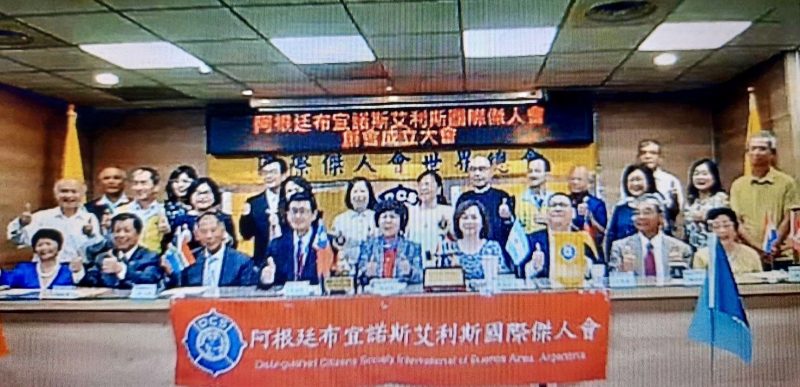接著台灣時間下午8時,阿根廷布宜諾斯艾利斯時間上午9時,舉行阿根廷布宜諾斯艾利斯國際傑人會成立大會,同時連線阿根廷,由創會會長陳碧華帶領全體會友於副會長胡圓圓的餐廳舉行。首先由總會長吳毓苹授旗、頒發當選證書及致贈會議鐘、會務基金給阿根廷布宜諾斯艾利斯國際傑人會創會會長陳碧華(由阿根廷嚴佩玲代表接受)。阿根廷布宜諾斯艾利斯會創會會長陳碧華;副會長胡圓圓、余承諭、黃勝煌;秘書長傅文文、財務長李茂勇。