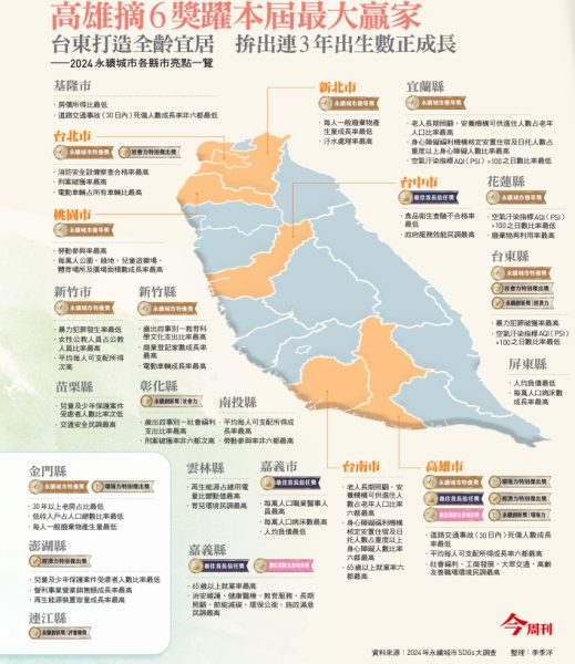 綜觀整體調查結果,今年度有二個新進榜縣市(高雄市、台東縣),有四個縣市連續四年蟬聯「永續城市特優獎」(台北市、新竹縣、金門縣、新竹市)。2025年台灣即將邁入超高齡社會,如何保障高齡族群的生活品質和經濟安全,是縣市不容忽視的急迫議題,今年特色獎項「最佳高齡友善城市獎」由高雄市及嘉義縣拿下。新設「永續創新獎」是今年另一大亮點,不同其他獎項透過統計指標與問卷民調評比,向全台二十二縣市政府徵求「社會力」、「經濟力」、「環境力」三面向的創新解方,並由該領域的專家學者共同評選,共有台東縣、彰化縣、高雄市及連江縣四縣市獲獎。