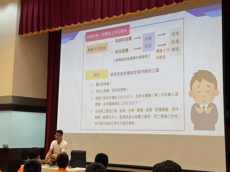 此次訓練課程涵蓋了各項救災救護技能的實務操作演練外,為提升新進人員對「廉政法規」及「預防詐騙」之觀念與重要性。於本(18)日課程排定「廉政倫理與規範」由該局政風室林主任三龍擔任講師,透過有趣生動的互動與淺顯易懂的解說,深入剖析如何避免遭受詐騙、分辨「圖利」與「便民」的界線與收受財物、飲宴應酬及請託關說等處境,並強調依法行政與公務廉政倫理的重要性。林主任引用時事新聞與實務案例,將廉政課程以淺顯易懂的方式呈現,讓新進人員深刻理解職務中的責任與義務。課堂上,均能積極參與討論,踴躍向講師請教,氣氛活絡,課程獲得熱烈迴響。