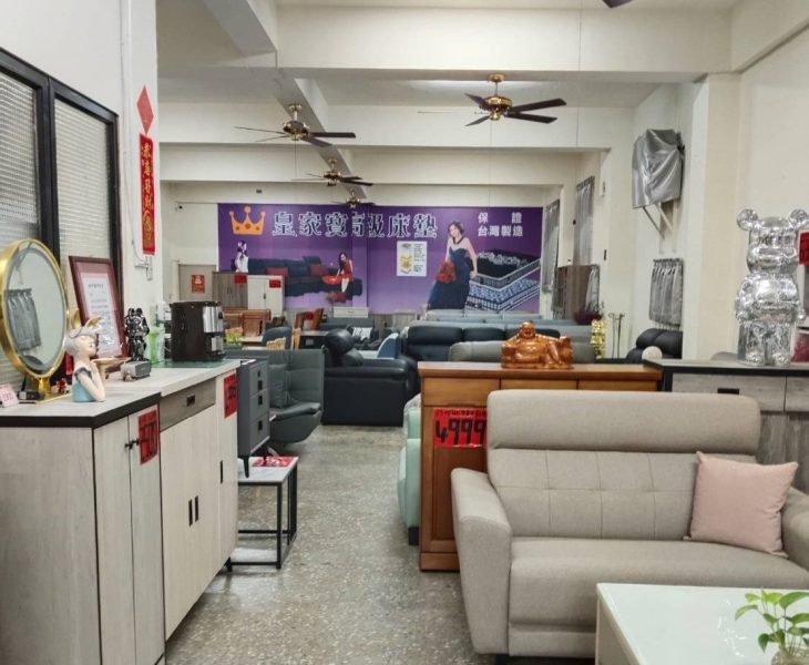 位於台南市永康區皇家寶傢俱沙發,有趣的、吸睛的斗大招牌「不夠俗老板八肚痛,AJ哥就是你的愛」
