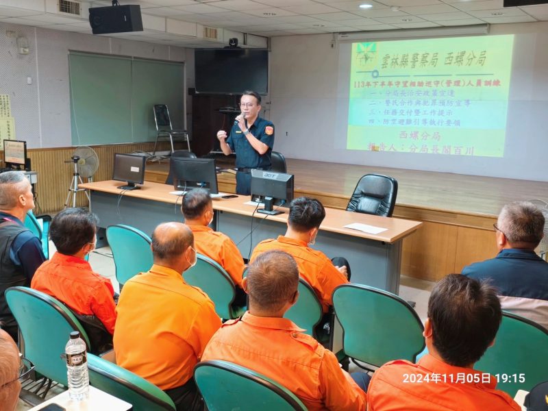 西螺分局為充實守望相助巡守(管理)人員治安巡守、減災、婦幼安全保護及相關法律知識,精進服勤技能,故特別於11月5日在分局1樓視聽教室辦理是項訓練,並以各守望相助隊新進隊員為優先召訓對象。
