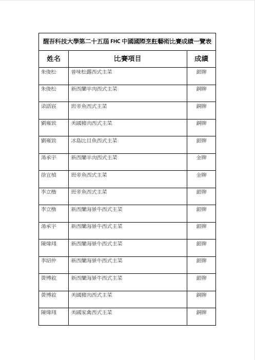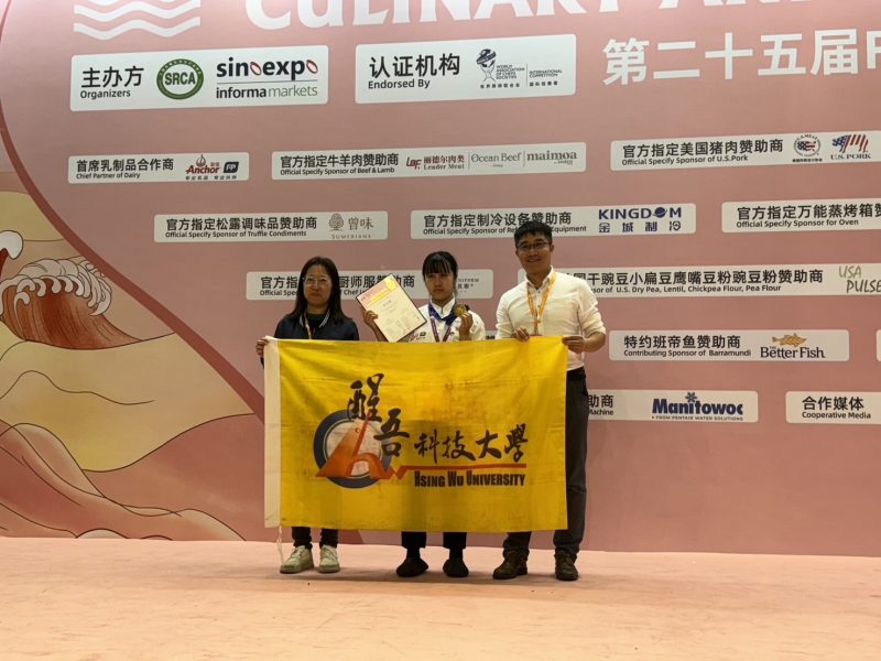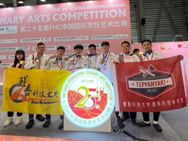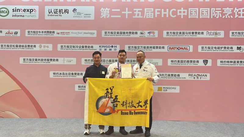 第二十五屆FHC中國國際烹飪藝術比賽昨(14)日落幕,醒吾科技大學由餐旅管理系朱俊松老師領軍,帶領學生前往上海參賽,共奪得兩金八銀五銅的亮眼成績,特別是餐旅系學生徐宜楨,首次參賽就摘金,為校爭光。帶隊的朱俊松老師及梁語宸老師,都是來自業界名廚,此次也參與比賽。朱俊松老師拿下曾味松露西式主菜銀牌,和新西蘭羊肉西式主菜銅牌,而梁語宸老師則獲得班帝魚西式主菜銅牌。
