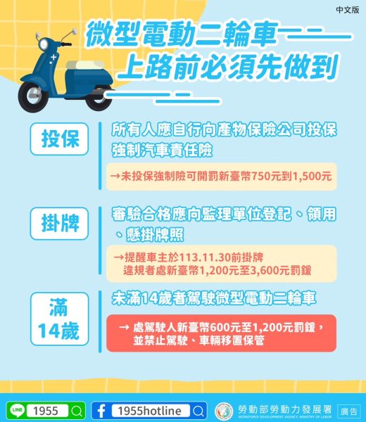 立法院於111年4月19日修訂道路交通管理處罰條例第69條之1微型電動二輪車,應經檢測及型式審驗合格,並「登記、領用、懸掛牌照」後,始得行駛道路,當時給予於修正施行前已經檢測及型式審驗合格,並黏貼審驗合格標章之微型電動二輪車2年寬限期(至113年11月29日)完成登記、領用、懸掛牌照。