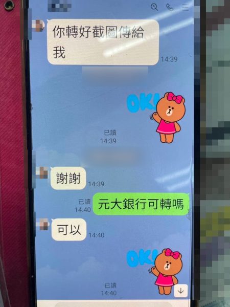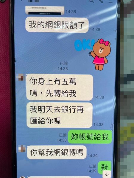 南警二分局中正派出所副所長鄭博文、警員林永謙,前天(29日)下午3時許接獲轄內永華路銀行行員通報,稱有1位婦人疑似遭到詐騙。員警到場後,許姓婦人自稱當日下午2時許接到自己認識的股票證券營業員友人LINE訊息,稱因網銀轉帳超出限額,要求許婦先借款新臺幣5萬元,並匯款至指定帳戶,過幾天就會還她錢,希望她到附近ATM,依這帳號匯款新臺幣5萬元,許婦一時失察、信以為真,就至永華路銀行臨櫃辦理,幸好銀行行員發現匯款帳號與她的營業員友人姓名不同,便通報員警到場處理。