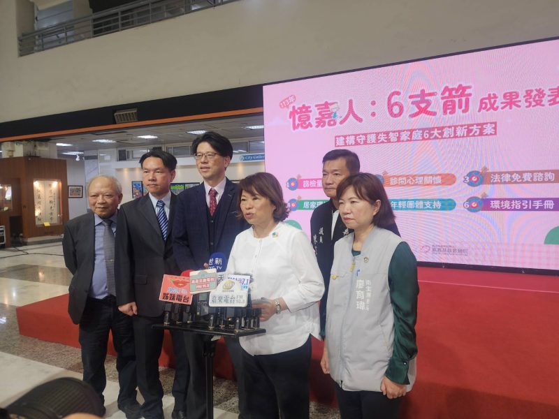 全國首創「憶嘉人6支箭」服務方案,包含篩檢量能擴大、診間心理關懷、法律免費諮詢、到宅環境改造、年輕團體支持、環境指引手冊,今(6)日在市府中庭由嘉義市黃敏惠市長、衛生局廖育瑋局長、嘉義基督教醫院陳煒院長、失智症整合中心陳誠仁主任、失智長輩及家屬,攜手合作共同展現嘉義市推動失智友善服務的決心,期望藉由這六項創新措施,為失智家庭構建安心生活,也讓失智症患者不再恐懼走入人群中,同時更多人了解失智症患者可能的行為與延緩失智症病情的因應措施,共創全齡宜居的幸福城市。
