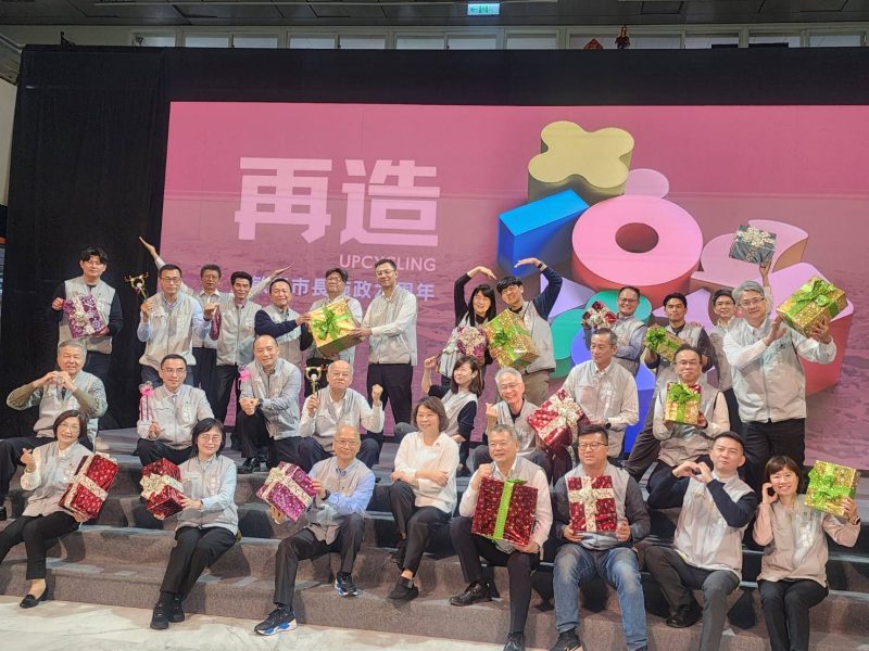 典禮最後,市府團隊共同堆疊起象徵永續、多元的繽紛「嘉」字拼圖,由黃敏惠市長拼起「嘉」字中心位置的大同心圓,如同「桶箍」一般,統合市府團隊,為市政掌舵,讓嘉義市走在正確的道路上,帶領城市永續幸福。今日適逢耶誕節,黃敏惠市長也與市府局處長拿起禮物盒,期待繼續為這座城市獻上美好與幸福。