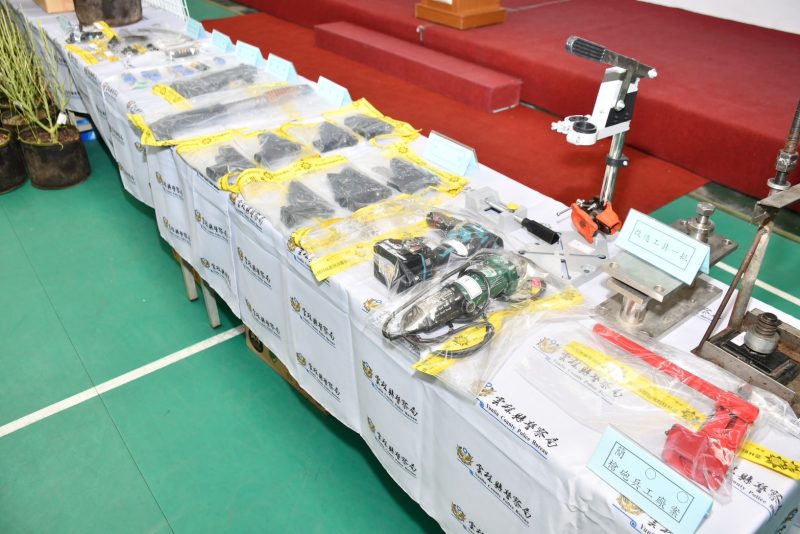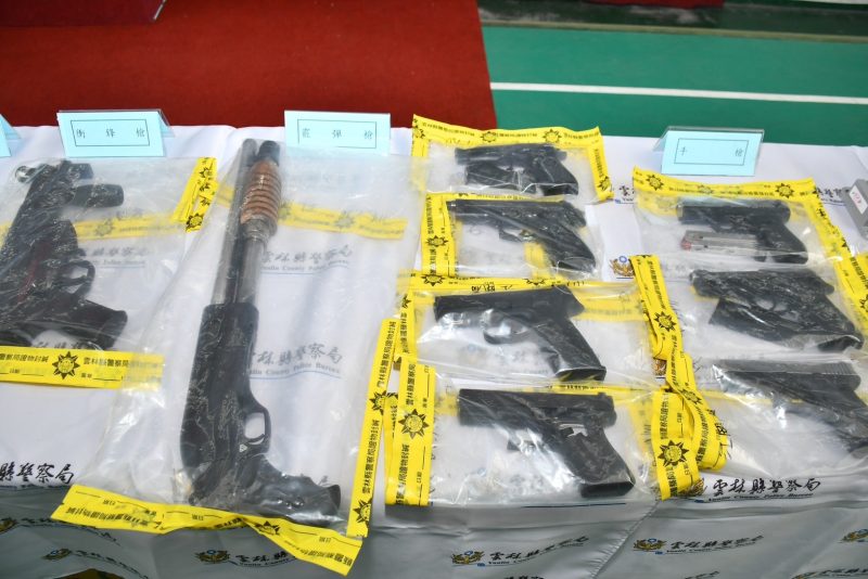虎尾分局日前接獲槍毒情資,遂報請臺灣嘉義地方檢察署檢察官指揮偵辦,經核定拘票及搜索票後,會同國道公路警察局第四大隊、嘉義縣民雄分局共組專案小組,跟監多時鎖定一處汽車旅館,警方荷槍實彈進行攻堅,眼見嫌犯不斷拖延時間,意圖跳窗脫逃且槍不離身,為免槍彈無眼誤傷無辜,雲林勇警直接破門,先發制人開2槍示警,現場驚險萬分所幸無人傷亡,終順利逮獲簡姓男子(35歲)及林姓男子(29歲)。隨即至簡姓犯嫌住處搜索,查獲改造手槍6把、霰彈槍1把、霰彈子彈11顆、子彈49顆、375麥格農子彈2顆、煙火球2顆、電鑽、砂輪機、車床、研磨機等改造手槍工具一批,二級毒品安非他命166.9公克等證物,現場猶如小型「兵工廠」,全案訊後將簡男依違反槍砲彈藥刀械管制條例、林男依違反毒品危害防制條例移請嘉義地方檢察署偵辦。