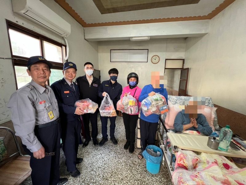 21日當天由劉員與役男陳威儒、義警張忠哲、楊松柏等員代表大灣派出所,與博愛菁莪愛心會至轄內發送物資,共計關懷17名弱勢民眾,而民眾對於員警送暖深表感謝,紛紛合影留念。