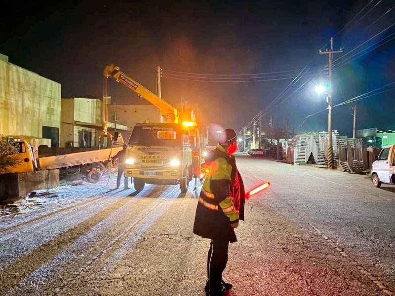 警方到場警戒,並迅速依規定處理後排除現場,確保來往車輛不受影響。警員徐政揚及王奕翔到場處理,駕駛人向警方表示其駕自小貨車因疲勞駕駛,不小心撞到路邊電桿,再側翻衝入農田中。