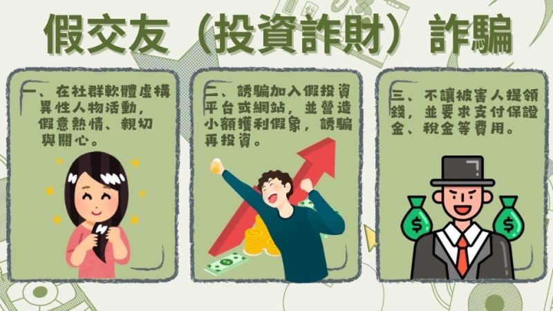 警察局長李建民表示,「愛情不會從天下掉下來,只有騙子會從網路跑出來」,提醒這類假交友(投資詐財)詐騙,都係利用交友軟體虛構異性人物,營造友善、貼心的形象,與被害人建立關係。 之後假稱有賺錢機會,誘騙被害人出借或自行投入資金,而投資過程中營造還款假象,騙取被害人更多資金,甚至要求信貸。因此提醒民眾網路交友,談及賺錢機會、投資、信貸,一定是詐騙。若網友提出金錢要求時,千萬不要匯款或借款。