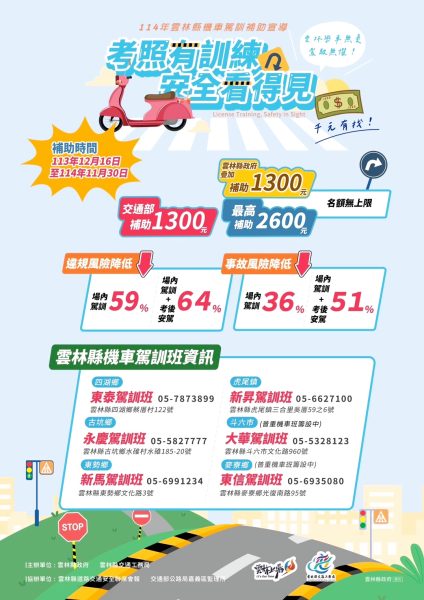 「考照有訓練,安全看得見!」交通部持續推動機車駕訓制度,即日起至114年11月30日止,凡在雲林地區駕訓班參加機車訓練並考取駕照,專案補助每名受訓學員新臺幣1,300元。