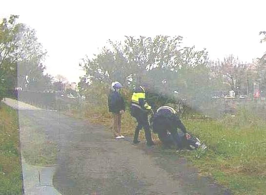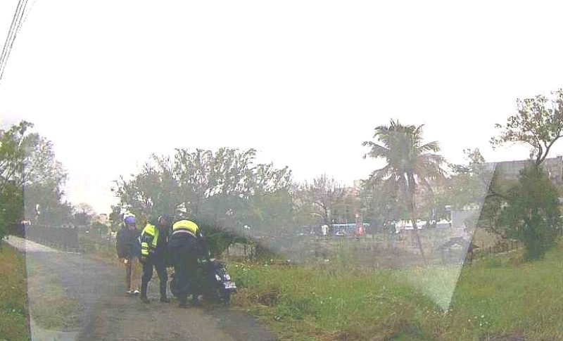 一名家住彰化溪州鄉的賴姓女子,日前獨自至雲林監理站考取機車駕照,騎乘機車返家途中因不熟悉路況,誤闖斗六市後庄埤親子公園周邊死巷,倒車時連人帶車滑落1米多深的邊坡。所幸賴女反應迅速即時跳車,僅受驚嚇未受傷,但機車卡在陡坡下動彈不得。 雲林縣斗六分局公正派出所接獲民眾報案後,立即排遣線上警力巡佐葉炳男、警員黃祐羣趕赴現場,發現賴女站立在邊坡不知所措。