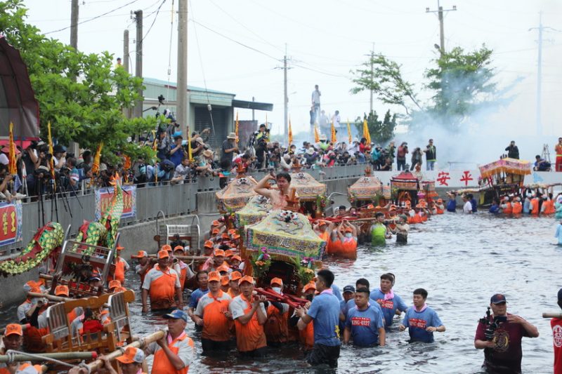 時辰一到,地主尹王爺所乘坐之神轎率先衝入水中迎接客王,其餘神轎陸續跟進,起乩的轎伕在水中橫衝直撞,因為水深,轎班以雙手將神轎舉高,直到感應客王降臨才上岸準備起駕回鑾。回程途中,信眾都會趴跪在路中,等待神轎通過「鑽轎腳」以求平安。