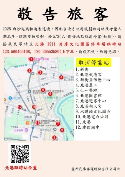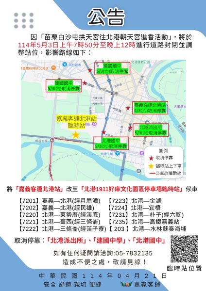因應苗栗白沙屯拱天宮媽祖往北港朝天宮進香活動,預計逾有三十萬香燈腳湧入,雲林縣警局北港分局將於5月3日上午6時起,擴大進行交通管制,部份道路封閉並調整客運停靠的站位。