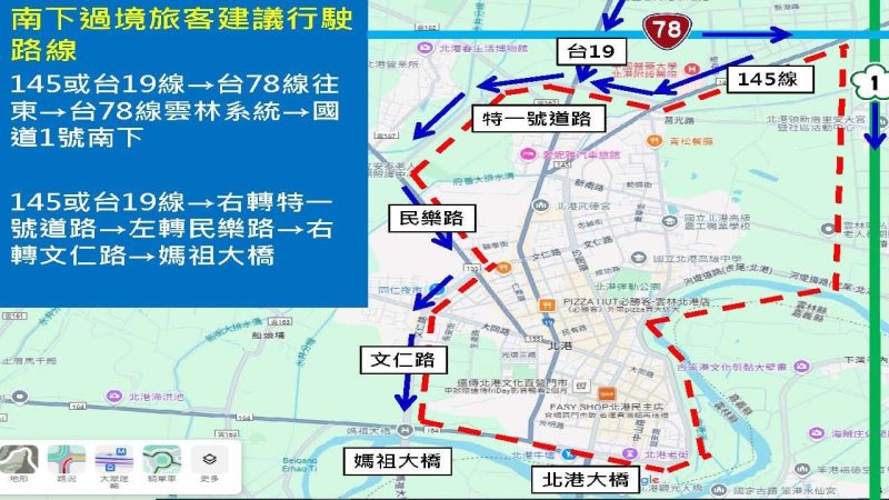 南下車流改道 路線一:台一九線入轄後右轉特一號道路,左轉民樂路,右轉文仁路,通往媽祖大橋 。路線二:雲一四五線由臺78線元長段東行至國一斗南交流道南下。