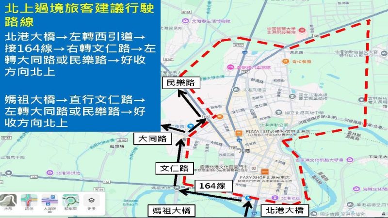 北上車流改道 路線一:北港大橋入轄後左轉西引道,接一六四線,右轉文仁路,左轉大同路或民樂路,往好收方向。路線二:媽祖大橋入轄後直行文仁路,左轉民樂路,往好收方向 。