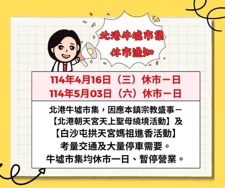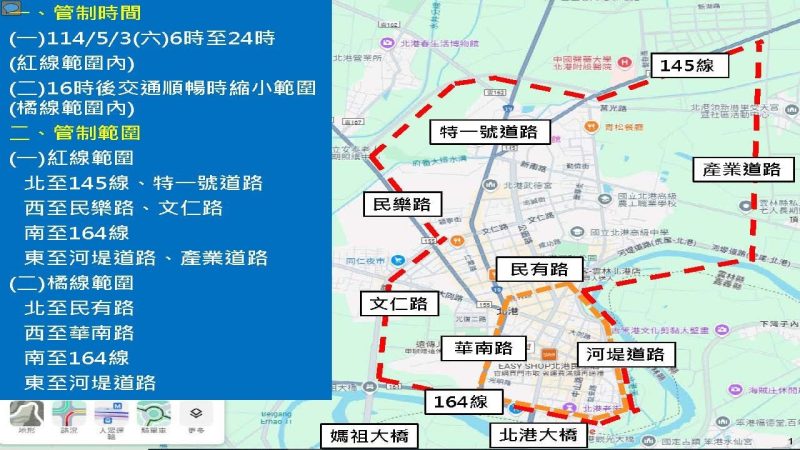 五月三日上午六時起至下午廿四時止,北港市區劃定為管制區,禁止車輛進入。下午四時起視交通狀況縮小管制範圍至朝天宮周邊區域。民眾請依員警指揮,將車輛停放於外圍停車場,再步行前往參香。