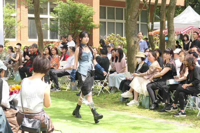 圖三:醒吾科大時尚系畢業展「拾憶•聚」在陽光下走秀的模特兒成為全校注目的焦點, 設計師周芳瑋作品「廢彩」。