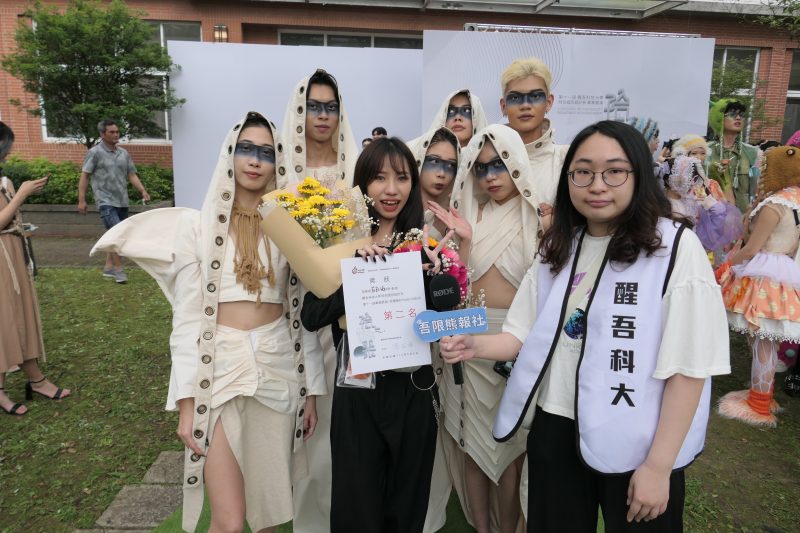 圖 醒吾科大校長陳寶億(左一)頒發第一名,由設計師王羽萱(左三)的作品「鎏·影」 拿下第一名,作品理念是過去式與未來式的碰撞。
