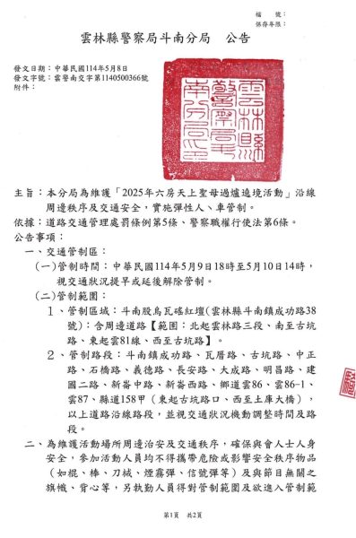 斗南分局提醒當日參與遶境民眾,遶境時應聽從警察及廟方人員指揮,隨隊伍有序行進,配合管制區域管制及改道行駛,勿將車輛停放於禁止停車管制路段及攜帶以危害他人生命身體秩序之物品。斗南分局祝大家吉祥平安。