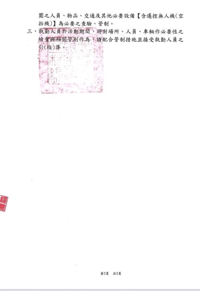 三、為維護活動場所周邊治安及交通秩序,確保與會人士人身安全,參加活動人員均不得攜帶危險或影響安全秩序物品(如棍、棒、刀械、煙霧彈、信號彈等)及與節目無關之旗幟、背心等,另執勤人員得對管制範圍及欲進入管制範圍之人員、物品、交通及其他必要設備【含遙控無人機(空拍機)】為必要之查驗、管制。