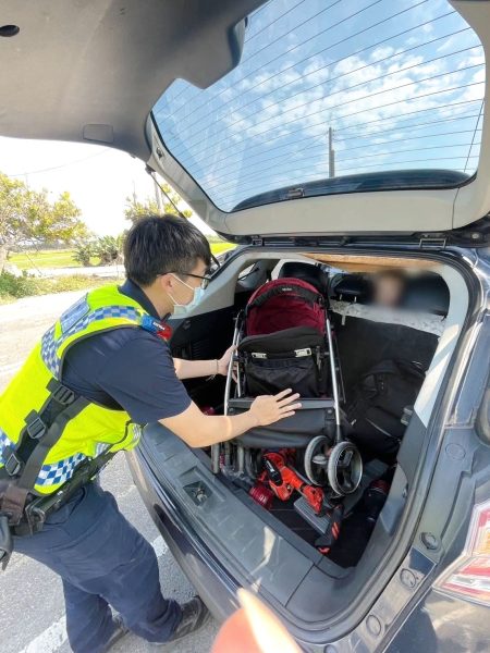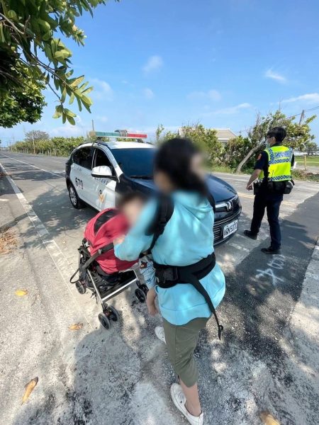 日前15時許,飛沙派出所警員郭子廷、莊詠貿執行交通稽查勤務,行經內湖村雲136線時,發現一名女子胸前以揹巾揹著一個嬰兒,前方嬰兒車裡還有一個嬰兒,蹲坐在路旁,臉色蒼白,員警擔心發生危險,立即上前關心。