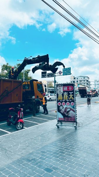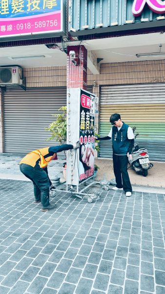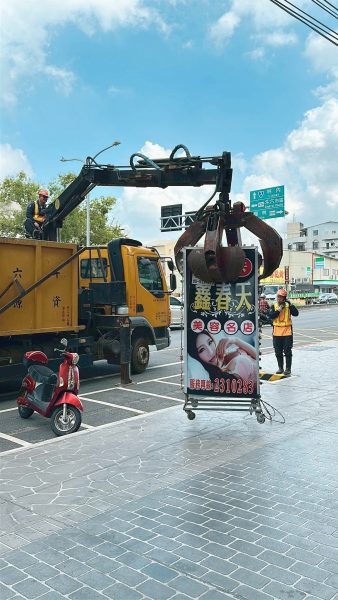 此次清道專案重點針人行道上於交通錐、盆栽、廣告招牌等雜物占用道路的情況加強勸導與取締,並由清潔隊負責清除路障。