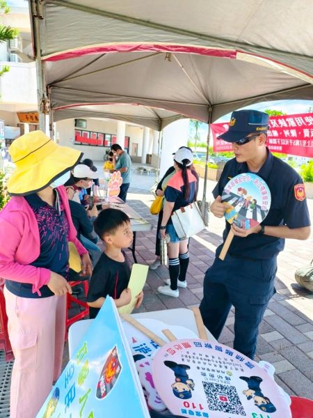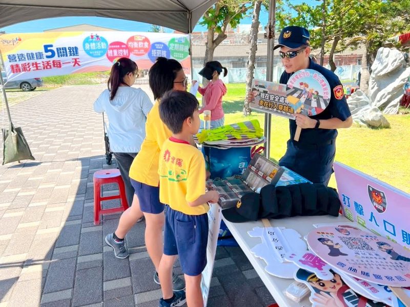 此外,「小小警察體驗活動」員警現場提供交警背心讓孩童穿著拍照,孩童爭相排隊拍照,小小警察對著鏡頭開心的喊「讚!」氣氛相當熱絡,員警手持宣導手板透過有獎徵答與學童互動,寓教於樂,讓學童知道遵守交通規則的重要性,也注意到除了自己遵守交通規則外,也要防範駕駛人疏忽或違規而造成的交通事故風險。