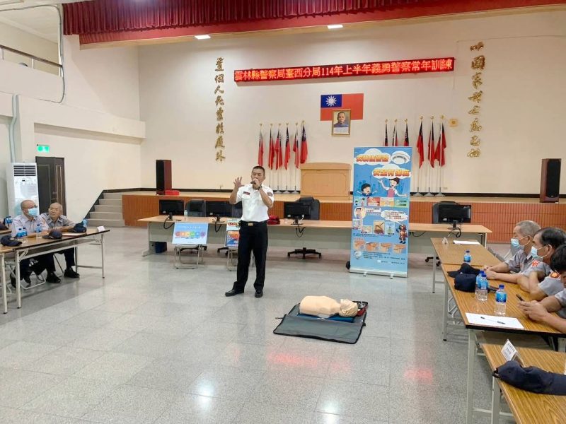 此外,警察局保安科科長李建興針對全社會防衛韌性、協勤要領及各項福利措施規定進行宣講。接著由臺西消防分隊進行心肺復甦術及止血帶操作訓練等課程。