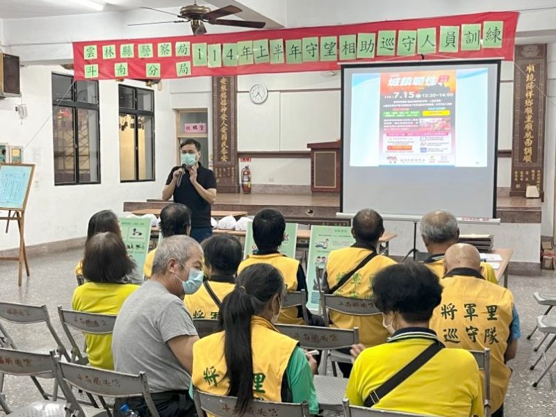 斗南警分局114年上半年守望相助巡守人員訓練於6月17日晚上7時在斗南順安宮香客大樓舉行,為有效的結合守望相助巡守人員等協勤民力,充實對治安維護及犯罪預防等相關法律常識。