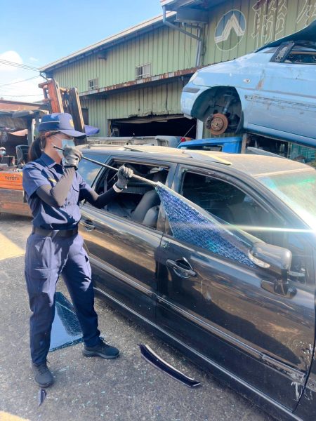過去,警方的破窗訓練往往受限於缺乏實體教具,多半僅能透過口頭講解或動作比劃進行,導致員警缺乏臨場經驗,在面對真實突發狀況時,不僅難以有效應對,更可能增加自身受傷的風險。為徹底改善此一困境,虎尾分局積極聯繫,獲得「聯發環保企業社」的大力支持,慷慨提供各式報廢車輛及訓練場地,讓員警得以親身學習擊破車窗的技巧。